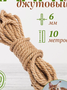 Канат джутовый 6 мм длиной 10 метров. Состав Джут натуральный 100%. Идеален для рукоделия,макраме,изготовления когтеточек, хозяйственных нужд, как аксессуар для рукоделия применяется в вязании джутовых корзин с толстыми стенками, плетеной мебели для дачи. Применение в декоре декоративного каната во все времена было модно, красиво и актуально. Джутовый канат применяется в декоративной отделке и называется джутовой веревкой (ландшафтный дизайн, отделка декоративных ограждений лестниц и т.д., обрамление беседок, качель и других мест домашнего отдыха). Натуральный канат подходит для отделки домов, бань, дач, беседок. Он выполняет функцию утеплителя, уплотнителя. Так же подойдёт для отделки спортинвентаря, шведской стенки. Предоставляет огромную свободу действий для дизайнеров, что позволяет им создать дом вашей мечты. Джутовый шпагат очень устойчив к внешним воздействиям, в том числе и солнечному излучению, этот фактор объясняется тем что он изготовлен и растительных джутовых волокон, а также не обходится без данной веревки текалаж. Домашние животные обожают когтеточки, домики из данного натурального шпагата. Бечевку можно использовать для домашних нужд, а также отличная пряжа.