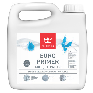 Euro Primer – концентрированная грунтовка на водной основе и акрилатном связующем для укрепления основания и выравнивания его впитывающей способности перед окрашиванием. Содержит противоплесневые добавки.